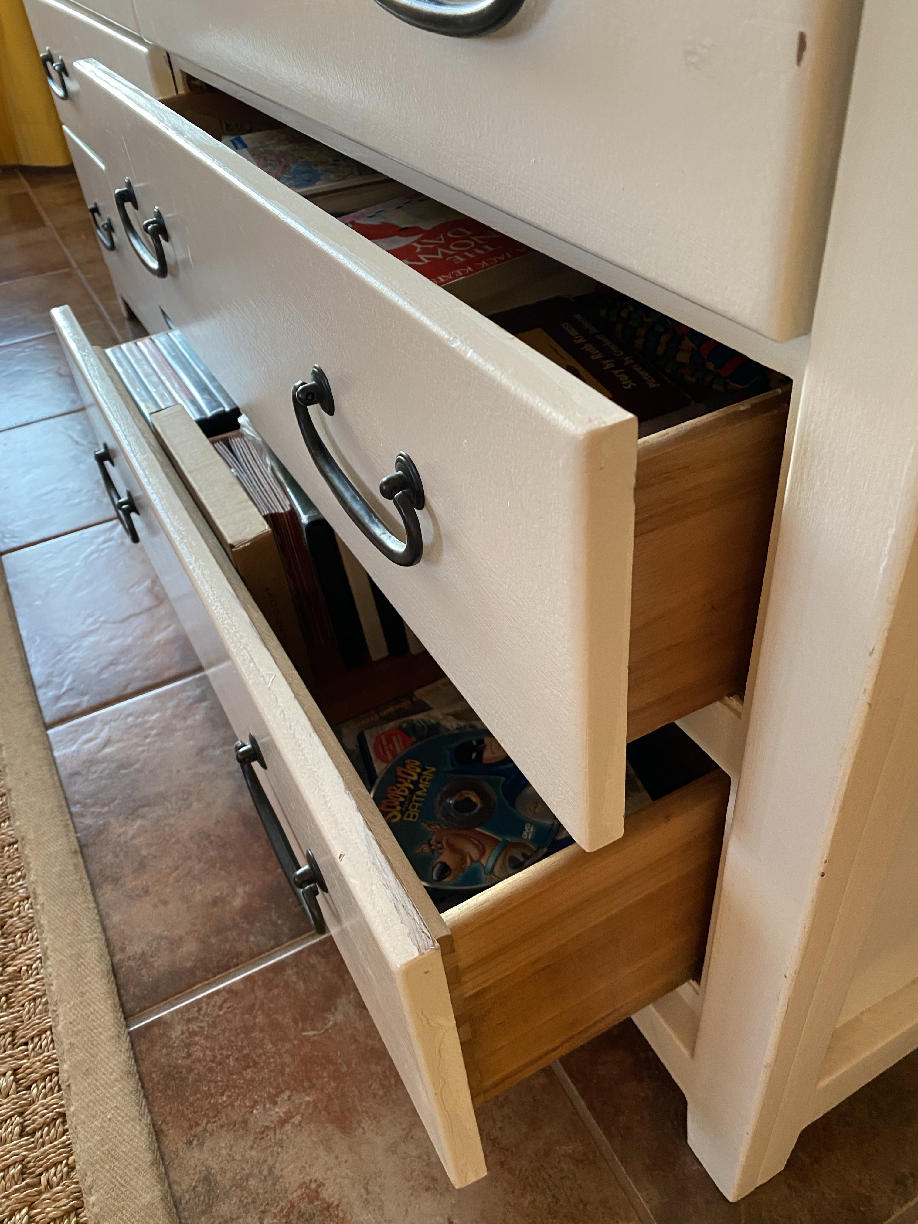For reference, this dresser was originally a medium brown. I sanded it a little bit, primed it, painted it with one coat of flat paint by accident and then went back over it with one or two coats of semi-gloss latex paint in China White by Benjamin Moore. The finish has held up well for quite a while, in spite of my very imperfect paint job. 🙂