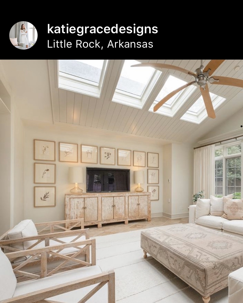 We bought our girls this tallish, fairly long dresser when they were toddlers. As they’ve gotten older, they’ve needed more space, so we bought them two separate dressers and moved their old dresser to the garage with plans to sell it. We’d just moved when we bought their new dressers and I wasn’t quite sure how to configure all our rooms. I was in need of a piece of furniture for our sunroom to hold our TV, some dvds, remote controls and video games. After scouring the internet for inspiration, and coming across the photo below, I realized that the girls’ old dresser would be a perfect fit for our sunroom and it would barely cost me a dime. I changed out the drawer knobs from pink porcelain knobs to oil-rubbed bronze nobs and voila, I had the perfect dresser for our sunroom. Inspiration photo here from one of my fave Arkansas designers:
