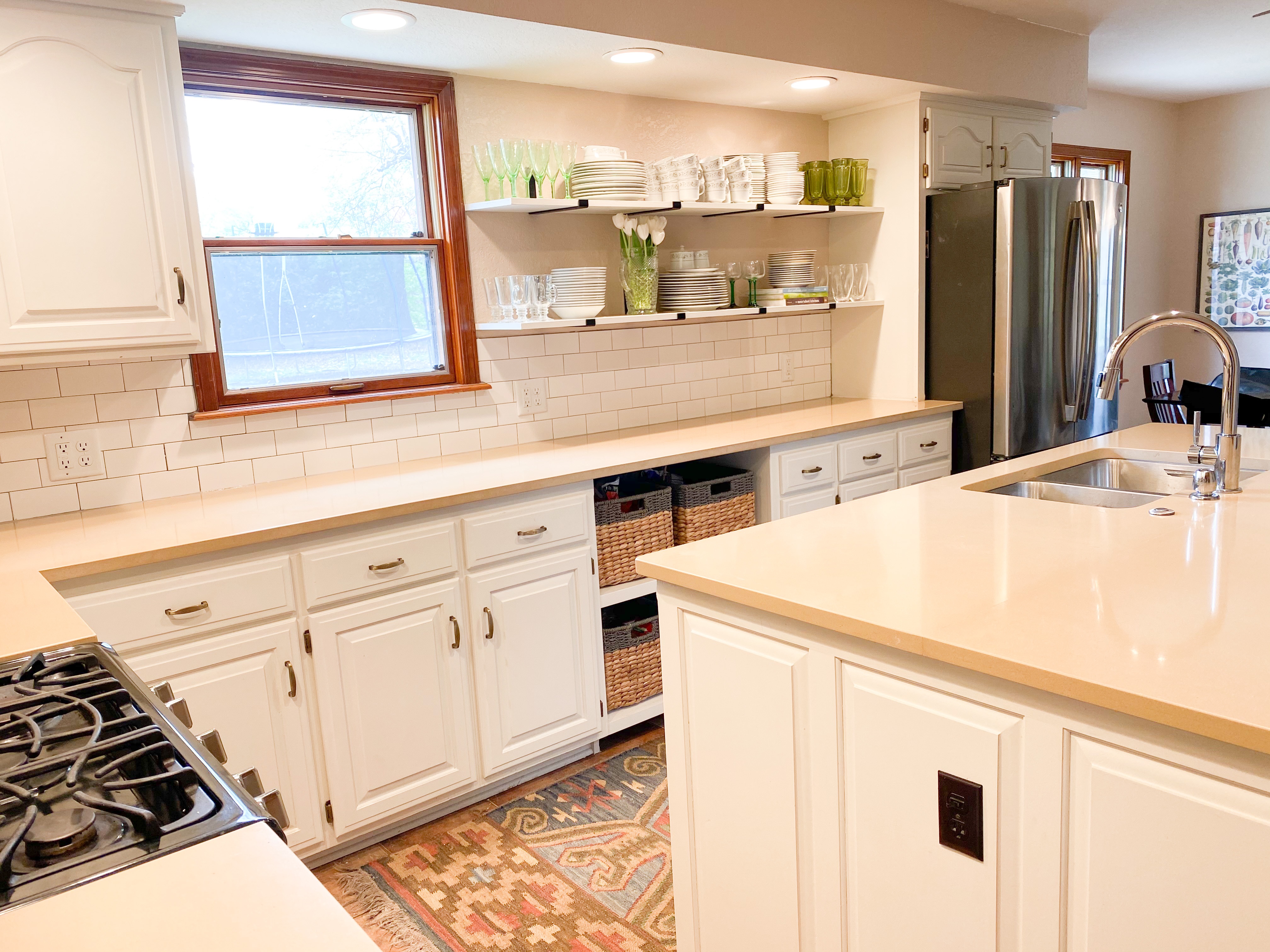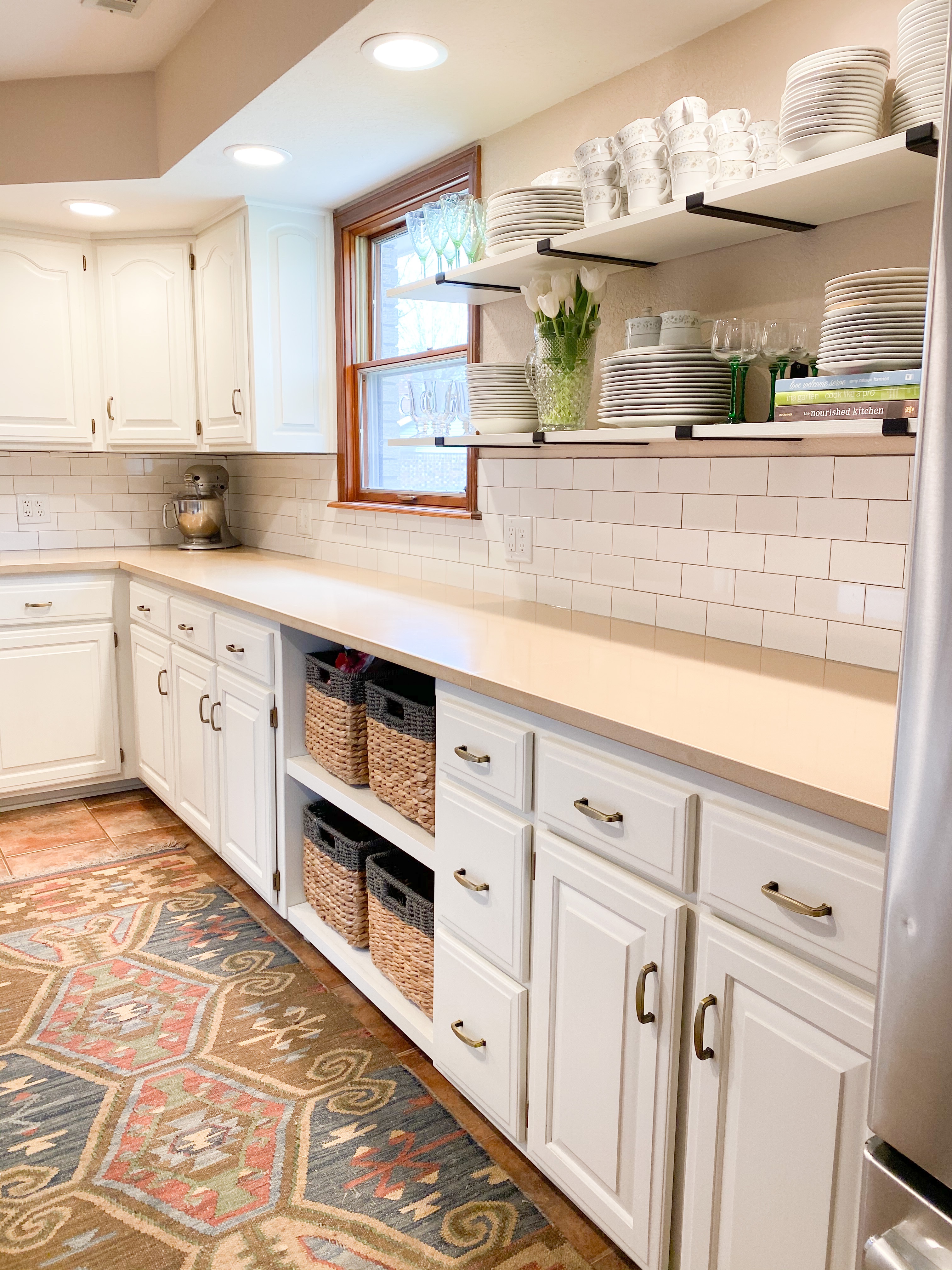 Overall, we’ve been so pleased with how our renovation turned out. I’m enjoying our quartz counters from Traders Market. They were very reasonably priced and are holding up well. The open shelves make me smile on the daily because I love seeing all my china on display. I also love the lower open shelving. That little space is a power house of storage. One basket holds bread, one basket holds crackers and chips, one basket holds onions and potatoes and one basket holds lunch box snacks. I love the convenience of having each one of those things close by when I’m cooking.