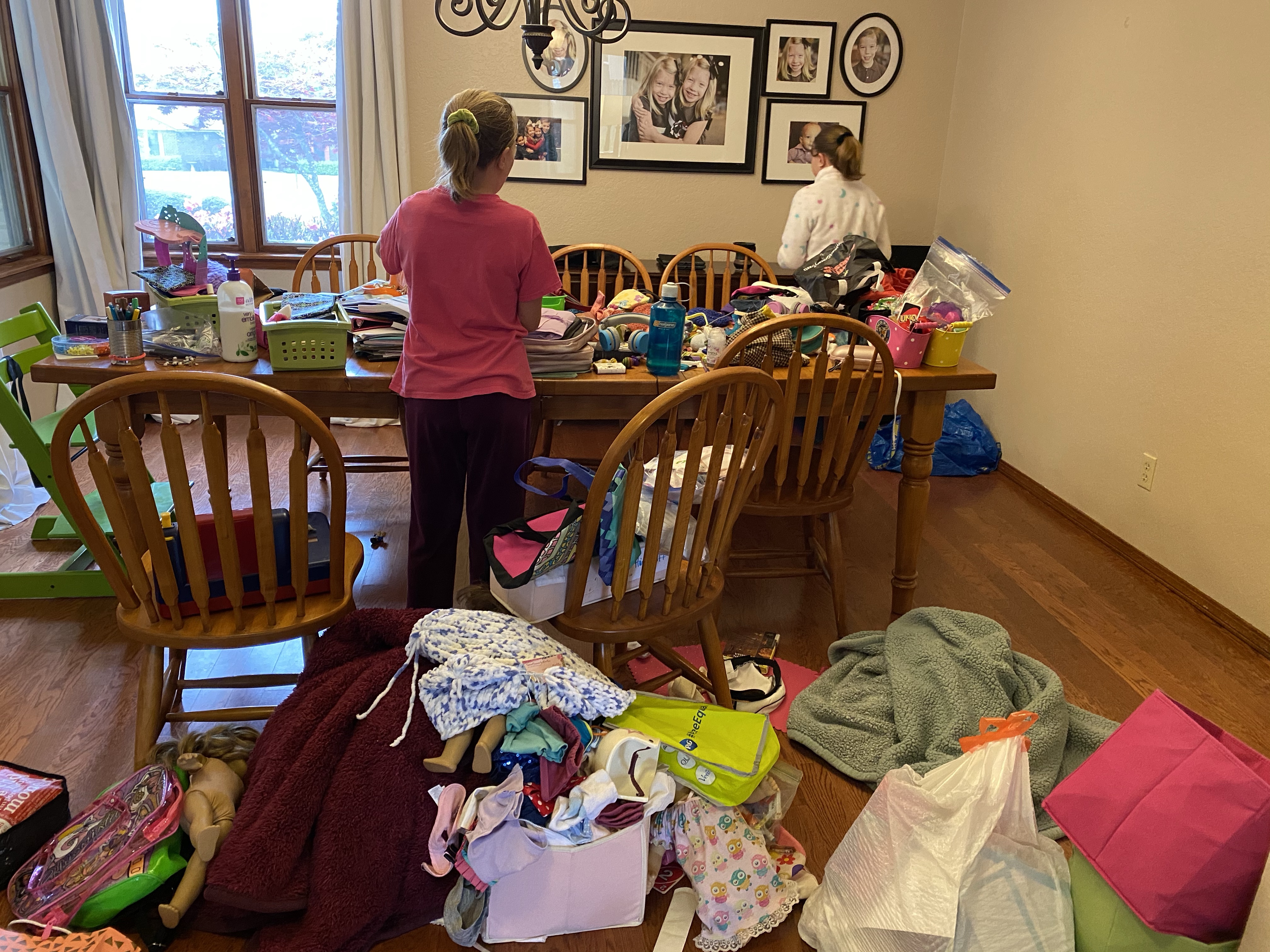 Another way I’ve kept their room from getting overwhelming is by periodically going through their rooms and getting rid of things that they aren’t using. Sometimes I involve them in this process, and sometimes I don’t. Of course, I don’t get rid of anything that is particularly special to them if I can help it. If you are familiar with the Marie Kondo method, this is what I used when we organized the girls room recently. We brought everything in their room other than clothing and furniture and organized it in our dining room (see below). This process took hours and I really felt like I deserved some type of medal by the time it was done. My hubs and I started out with the girls helping us, but we eventually sent them to go play in another room so that we could really organize all this random stuff.