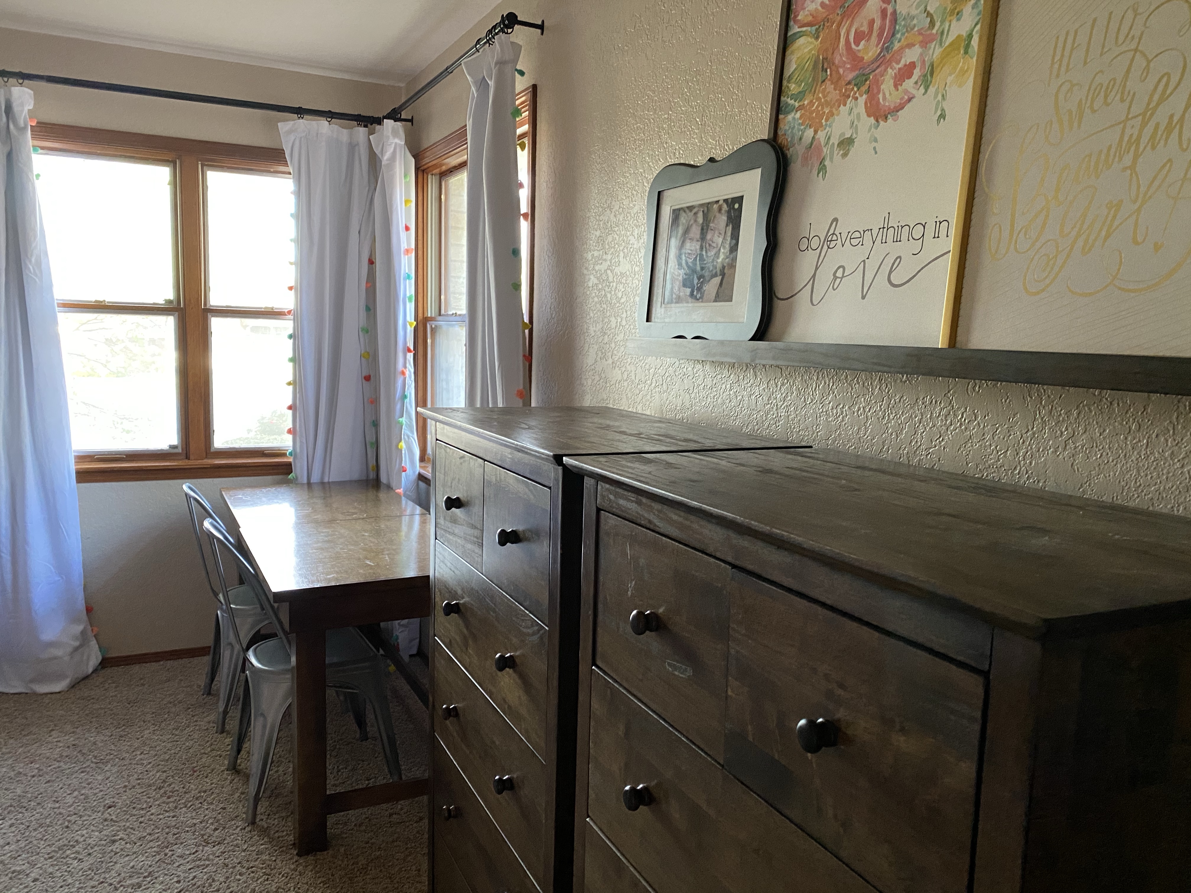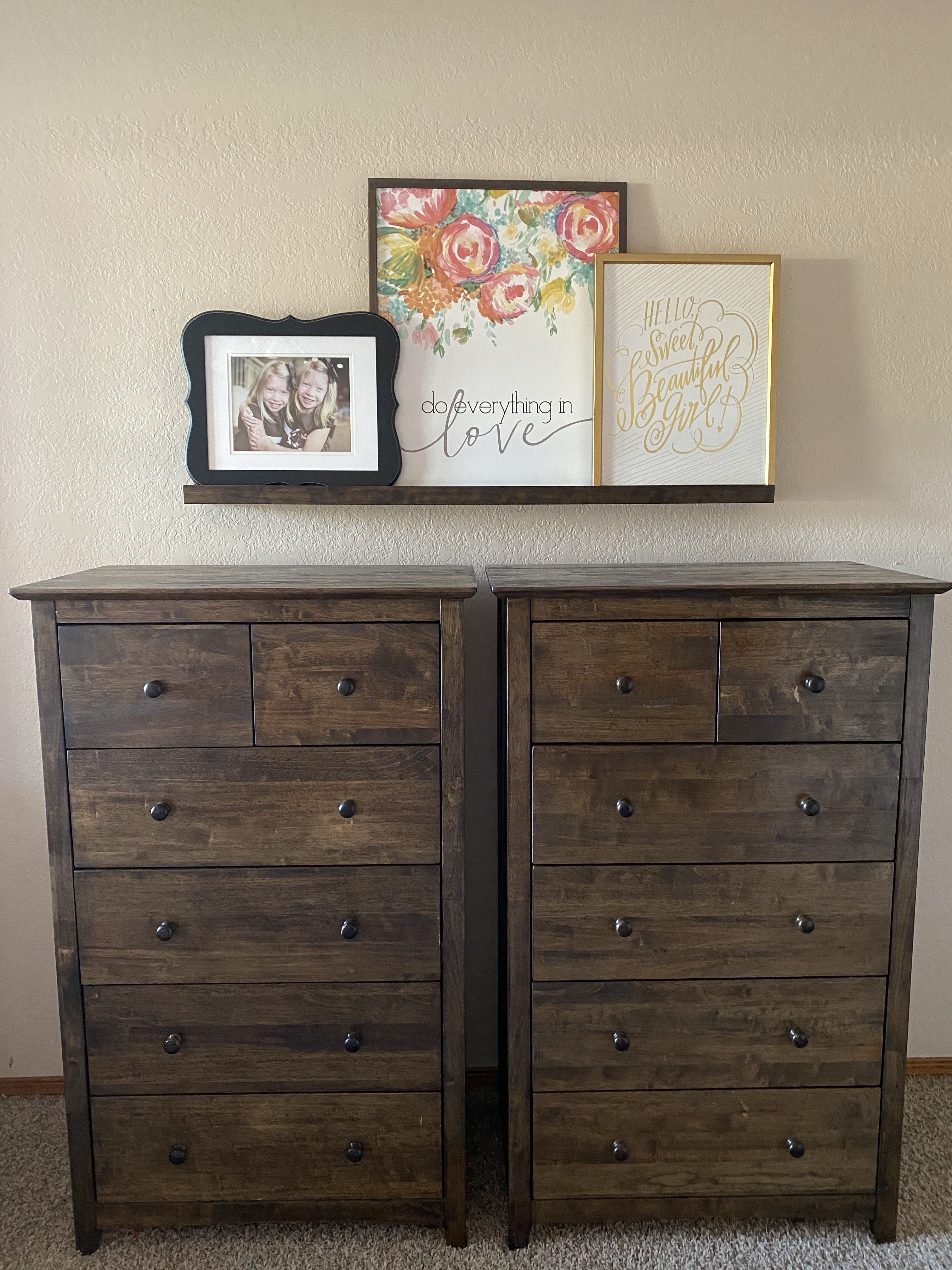 As for decorating their room, I bought them new curtains and rearranged their furniture just a bit. Before we spruced up their room, I had a chest of drawers on each side of the room, but their long, narrow room felt crowded. I moved the two chests together and hung a photo ledge that my husband made years ago above the chests. I styled the ledge with artwork that was already in their room. Hanging the ledge above the chests unifies the two pieces to make them look like one unit. This also helps the room to feel more open and airy.