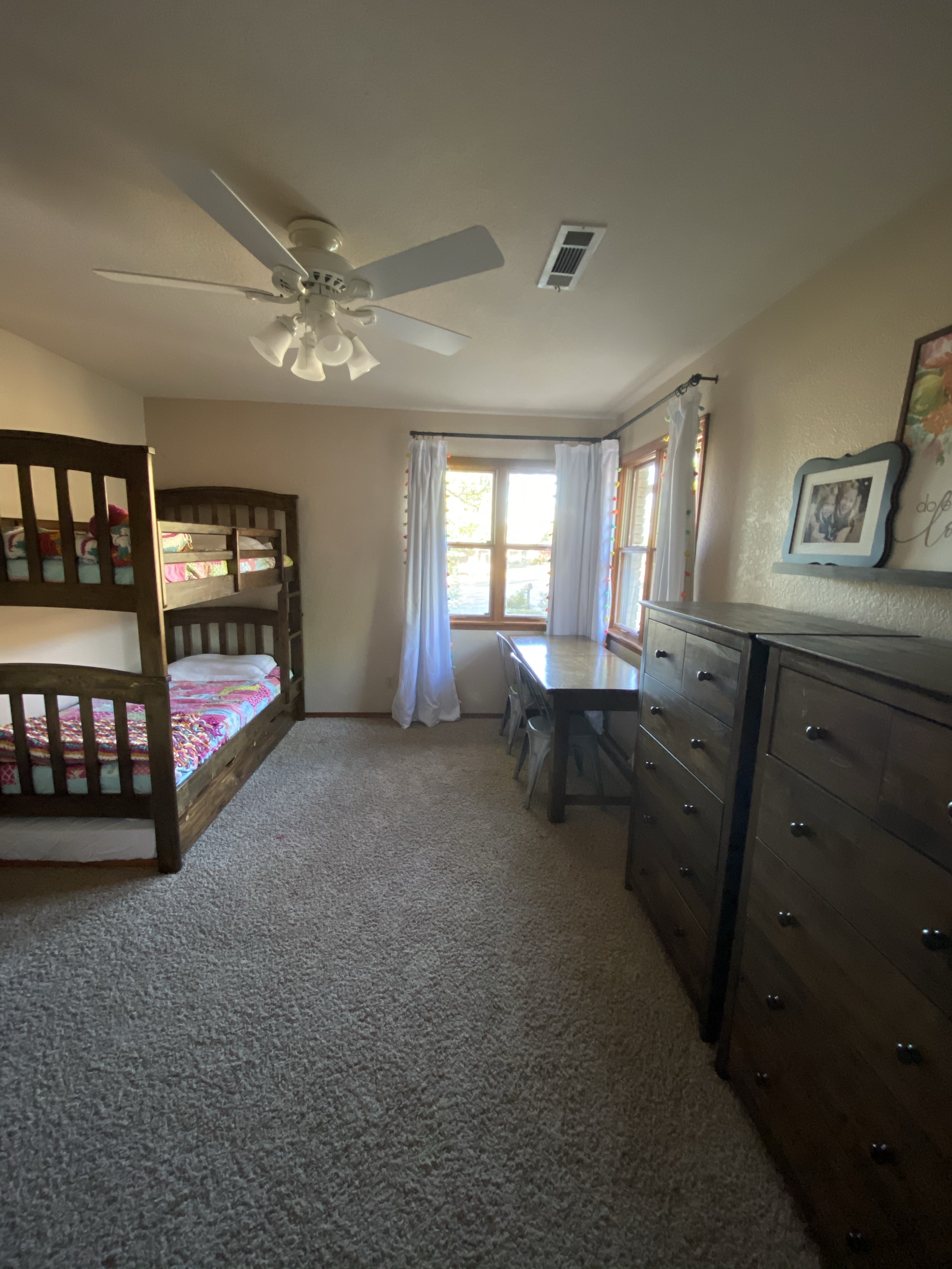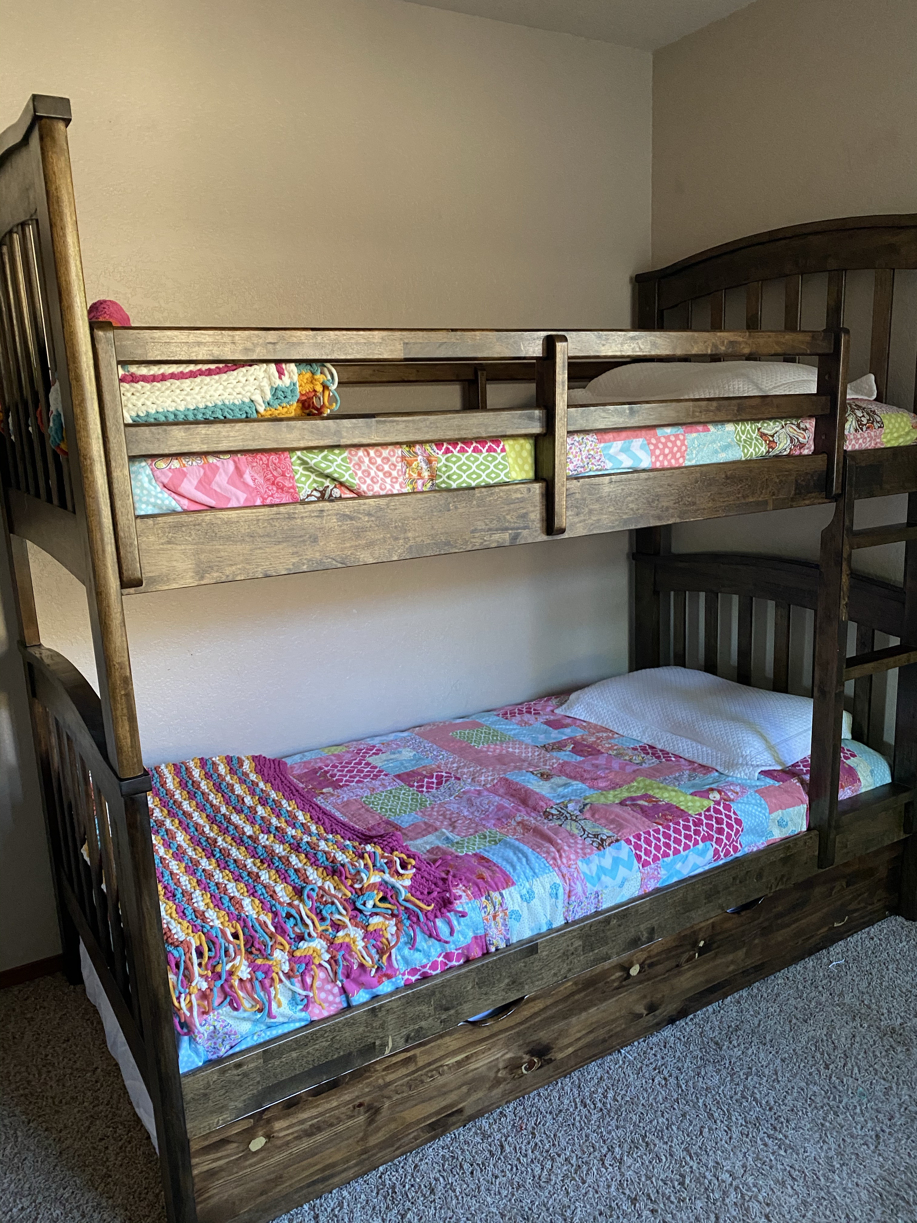 For their bedding, we’ve had good luck with these soft sheets from Amazon. I made their quilts for them a couple years ago and my sister knitted beautiful afghans at the foot of their beds. Again, I keep their bedding very simple. We have duvets and duvet covers that they use in the winter, but for now they are folded and in the closet.